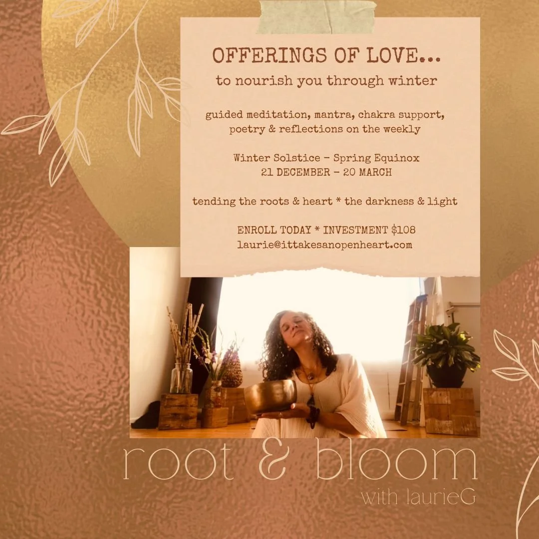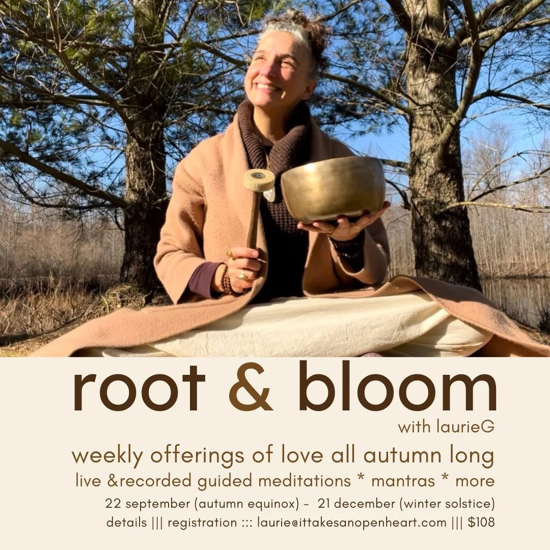 The 33rd season of Root & Bloom will launch on Autumn Equionx and all season long (up til Winter Solstice) you’ll receive doses of love in your inbox on the weekly- recordings of guided meditations & small doses of inspiration in audio, video & written form… and the opportunity to join in community for weekly Sacred Circle Sits.
